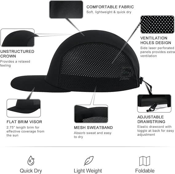 This hat is crafted from lightweight, stretchy fabric, a combination of 90% polyamide and 10% spandex for a soft touch and excellent elasticity, ideal for high-intensity running and daily training. The runners athletics hats features laser-perforated sides to enhance airflow, keeping you cool and breathable during exercise. The wide brim effectively blocks sunlight, and the elastic drawstring closure allows for quick and easy adjustment to fit different head shapes, ensuring a secure and comfortable fit. Internal moisture-wicking mesh quickly absorbs sweat and dries rapidly, maintaining comfort even after extended wear. The foldable design makes it portable and lightweight, ideal for outdoor runners. Express your attitude with a hat;